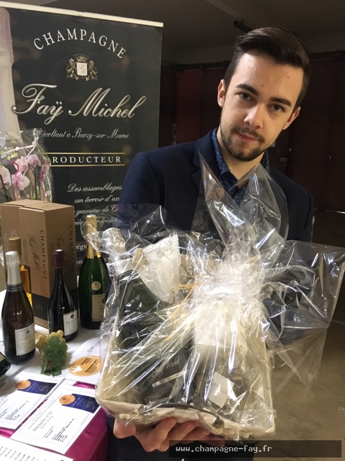Les paniers gourmands contenant une bouteille de Champagne Fay Michel Edition Limitée ainsi que des chocolats fins Jacques Guyaux